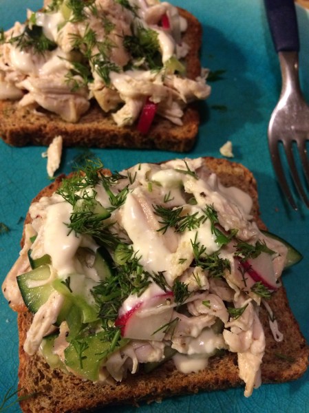 First off, finding good rye bread in the city of Wichita is nearly impossible, as well as chicken that is both skin-on and bone-in, and Persian cucumbers. Immediately I had to make some substitutions, including altering the type and amount of chicken to buy, the bread I ended up using (a version of the “dense health bread” Perelman recommends), and a regular cuke for a smaller one. From there, I had to adjust the cooking temperature and time for my finicky oven. Perelman also doesn’t write out each of the steps for slicing and dicing the vegetables, as well as when to create the horseradish creme fraiche, which I did while the chicken was cooking. I had to de-seed the cucumber as well, and determine how much of it made sense to use for my personal preference since I didn’t buy one of the smaller varieties. I also didn’t stick directly to her measurements—I never measure salt and pepper, for instance, because I use spice grinders, and I added at least a teaspoon more horseradish to my creme fraiche then she calls for. Because the amount of chicken I used also skewed the recipe, I blended in additional vegetables for balance. I intended to garnish my dish with parsley and dill, but realized at the last minute dill was all I had. Each of these decisions required me to think about the flavor and balance of the dish, and also forced me to analyze how best to proceed in cases of differing opinions.